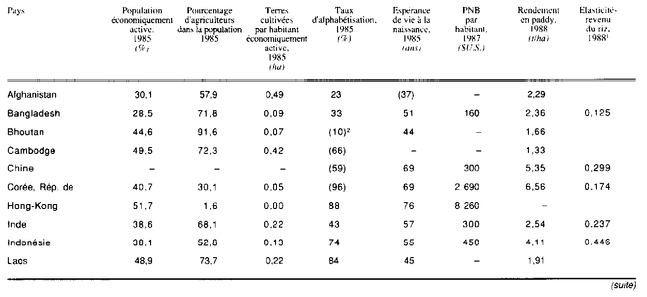 La situation nutritionnelle dans les pays consommateurs de riz varie beaucoup en fonction de tout un réseau de facteurs interdépendants touchant les conditions socio-économiques, le développement, le milieu culturel, l'environnement et le régime alimentaire. Quelle que soit la région, la plupart des économies tributaires du riz ont un taux de croissance démographique élevé, une riziculture à faible rendement (à l'exception de la Chine, de la Corée et de l'Indonésie) et un produit national brut peu élevé (IRRI, 1989) (tableau 9). Les parcelles cultivées sont de faible superficie, le pourcentage de la population économiquement active est bas et les taux d'alphabétisation sont variables en Asie tropicale (Banque asiatique de développement, 1989) (tableau 9).