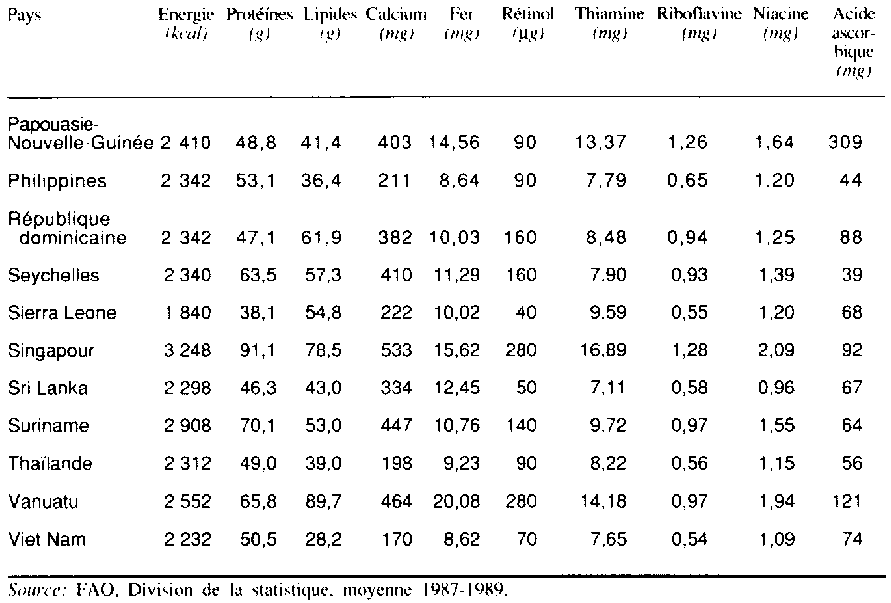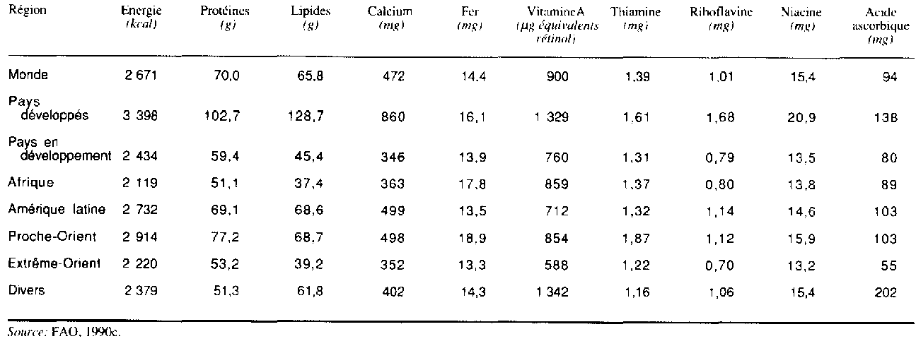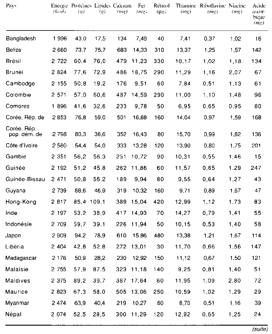 Les données provenant des bilans de disponibilités alimentaires fournissent des estimations des disponibilités d'aliments et de nutriments par personne, compte tenu de la production alimentaire, des importations, des exportations, des utilisations non alimentaires, des aliments transformés et des pertes au niveau du détail. Une comparaison de l'absorption quotidienne de nutriments dans les pays développés et dans les pays en développement (FAO, 1990c) (tableau 10) a révélé que c'est en Extrême-Orient qu'on enregistre les plus faibles disponibilités de matières grasses, rétinol, thiamine, riboflavine et acide ascorbique. Les données individuelles concernant les pays consommateurs de riz (tableau 11) montrent que, outre l'énergie alimentaire, de nombreux pays consommateurs de riz ont des niveaux peu satisfaisants de matières grasses, calcium, fer, riboflavine et acide ascorbique. Si l'on tient compte des pertes au niveau des ménages, y compris la perte à la cuisson, la situation du point de vue de l'offre se révèle encore plus précaire.