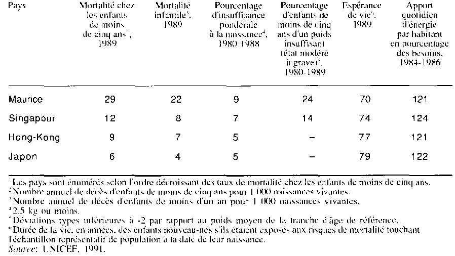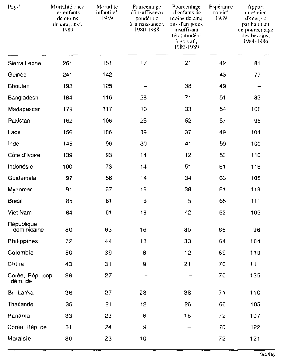 Le tableau 13 contient des informations sur quelques indicateurs importants de l'état nutritionnel global dans 34 pays consommateurs de riz(UNICEF, 1991). Il indique clairement que, dans la plupart de ces pays, le pourcentage d'enfants accusant une insuffisance pondérale à la naissance, la mortalité infantile et la mortalité chez les enfants de moins de 5 ans sont élevés et que la prévalence d'une insuffisance modérée ou prononcée du poids chez les enfants atteint des niveaux encore plus alarmants. L'espérance de vie est également faible. La moitié environ de la population d'Asie du Sud et d'Afrique subsaharienne reçoit une quantité insuffisante d'énergie pour mener une vie active de travailleur. Quelque 470 millions de mal-nourris vivent en Asie du Sud. Toutes ces données reflètent le mauvais état nutritionnel de la population.