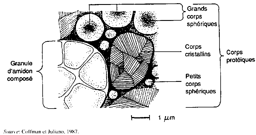 Les cellules de l'albumen ont une membrane mince et sont remplies d'amyloplastes contenant des granules d'amidon composé. Les deux couches de cellules les plus extérieures (la couche subaleurone) sont riches en protéines et en lipides, et les amyloplastes et les granules d'amidon composé y sont de plus petite taille que dans l'albumen interne. Les granules d'amidon sont des polyèdres; leur taille se situe principalement entre 3 et 9 µm, et leur distribution est unimodale. Les protéines sont présentes surtout sous forme de corps protéiques sphériques de 0,5 à 4 µm dans tout l'albumen (del Rosario et a/., 1968; Bechtel et Pomeranz, 1978) (figure 3). Des corps protéiques cristallins et des corps protéiques sphériques de petite taille sont localisés dans la couche subaleurone. Le corps protéique sphérique de grande taille correspond au PB-I de Tanaka et al. (1980) et le corps protéique cristallin est identique au PB-II. Le PB-I et le PB-II sont répartis dans tout l'albumen du riz.