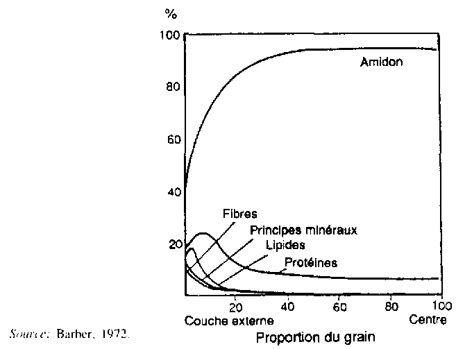 Parmi les fractions d'usinage du riz, le son est celle qui a la plus forte teneur en énergie et en protéines et la balle est celle qui en a la plus faible (tableau 14). Seule la fraction de riz cargo est comestible. L'usinage par abrasion ou par frottement pour éliminer le péricarpe, l'enveloppe, le tégument externe. la couche d'aleurone et l'embryon, afin d'obtenir du riz usiné, entraîne une perte de lipides, protéines, fibres détergentes brutes et neutres, principes minéraux, thiamine, riboflavine, niacine et tocophérol alpha. Les glucides digestibles, s'agissant principalement d'amidon, sont plus abondants dans le riz usiné que dans le riz cargo. Les gradients pour les divers nutriments ne sont pas identiques, ainsi qu'il ressort de l'analyse de fractions d'usinage successives de riz cargo et de riz usiné (Barber, 1972) (figure 4). La teneur en fibres alimentaires est la plus élevée dans la couche de son (et la balle) et elle est la plus faible dans le riz usiné. La densité et la densité volumétrique sont également les plus basses pour la balle, suivie par le son, et elles sont les plus élevées dans le riz usiné en raison de sa faible teneur en matières grasses. Les propriétés nutritionnelles du grain de riz sont examinées au chapitre 4.