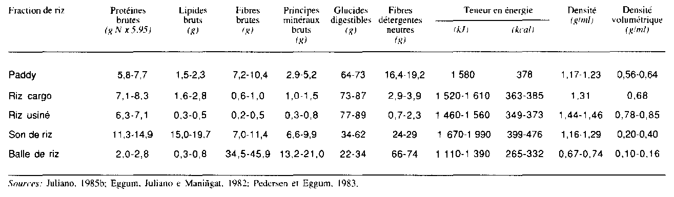 La balle constitue environ 20 pour cent du poids du paddy, mais les valeurs varient de 16 à 28 pour cent. Le poids se répartit ainsi dans le riz cargo: péricarpe, 1-2 pour cent; aleurone plus nucelle et tégument, 4-6 pour cent; germe, 1 pour cent; scutellum, 2 pour cent; albumen, 90-91 pour cent (Juliano, 1972). L'aleurone comprend de une à cinq couches de cellules; elle est plus épaisse du côté dorsal que du côté ventral et plus épaisse dans les riz à grains courts que dans les riz à grains longs (del Rosario et al., 1 968). Les cellules de l'aleurone et de l'embryon sont riches en corps protéiques, contenant des globoïdes ou du phytate, et en corps lipidiques (Tanaka et al., 1973; Tanaka, Ogawa et Kasai, 1977).