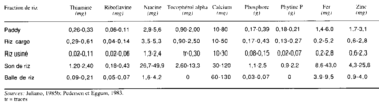 Les vitamines B sont concentrées dans les couches de son, tout comme le tocophérol alpha (vitamine E) (tableau 15). Le grain de riz ne contient ni vitamine A, ni vitamine D, ni vitamine C (FAO, 1954). Le gradient de localisation dans le grain de riz entier est plus accentué pour la thiamine que pour la riboflavine et la niacine, d'où un plus faible pourcentage de rétention de la thiamine (vitamine B1) dans le riz usiné (tableau 15). La moitié environ de la quantité totale de thiamine se trouve dans le scutellum, et de 80 à 85 pour cent de la niacine dans le péricarpe et la couche d'aleurone (Hinton et Shaw, 1954). L'embryon contient plus de 95 pour cent des tocophérols totaux (dont les tocophérols alpha représentent environ 30 pour cent) et près d'un tiers de la teneur en huile du grain de riz (Gopala Krishna, Prabhakar et Sen, 1984). D'après les calculs, 65 pour cent de la thiamine du riz cargo se trouvent dans le son, 13 pour cent dans les résidus de polissage et 22 pour cent dans la fraction de riz usiné (Juliano et Bechtel, 1985). Les valeurs correspondantes pour la riboflavine sont 39 pour cent dans le son, 8 pour cent dans les résidus de polissage et 53 pour cent dans la fraction de riz usiné. Pour la niacine, la répartition est la suivante: 54 pour cent dans le son, 13 pour cent dans les résidus de polissage et 33 pour cent dans la fraction de riz usiné.