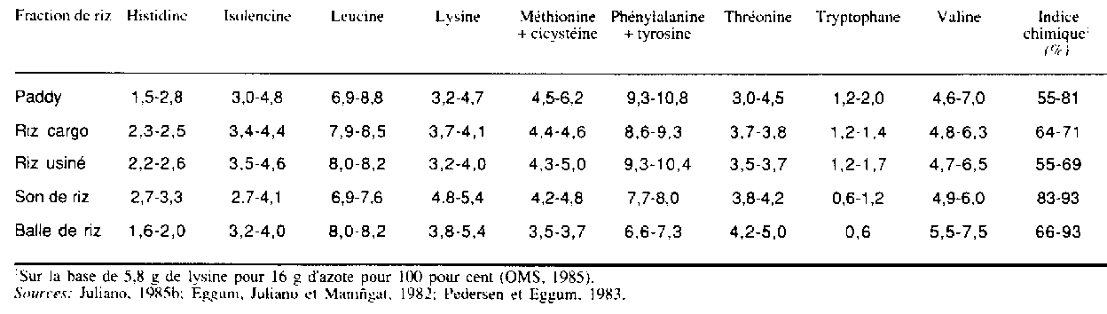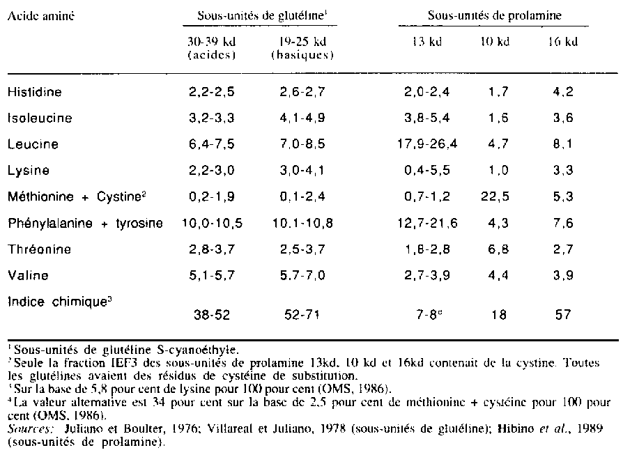 La teneur en acides ami nés essentiels de la sous-unité de glutéline (Juliano et Boulter, 1976; Villareal et Juliano, 1978) et de la sous-unité de prolamine (Hibino et al., 1989) révélait la lysine comme facteur limitant dans ces polypeptides, à l'exception de la fraction IEF3 de la sous-unité de prolamine de 13 kd, avec 5,5 pour cent de lysine et aussi comme facteur limitant la méthionine plus cystéine (tableau 17). Ainsi, la glutéline a un meilleur indice chimique (valeur en acides aminés) que la prolamine, abstraction faite de la sous-unité de la prolamine de 16 kd. La sous-unité de prolamine de 10 kd a une forte teneur en cystéine (6,8 pour cent).