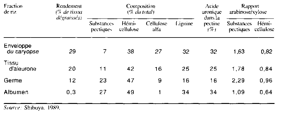 Les polyosides non amylacés se composent de polyosides hydrosolubles et de fibres alimentaires insolubles (Juliano, 1985b). lis peuvent s'associer àl'amidon, et il se peut qu'ils aient un effet hypocholestérolémique (Normand, Ory et Mod, 1981; Normand et al., 1984). L'albumen a une plus faible teneur en fibres alimentaires que les autres constituants du riz cargo (Shibuya, 1989) (tableau 18). Les valeurs signalées pour les fibres détergentes neutres se situent entre 0,7 et 2,3 pour cent (Juliano,1985b) (tableau 14). D'autre part, l'albumen ou membrane du riz usiné a une faible teneur en lignine mais une forte teneur en substances pectiques ou pectine. La pectine de l'albumen a une plus forte teneur en acide uronique, mais le rapport arabinose/xylose est moins élevé que dans les autres tissus du grain. L'hémicellulose de l'albumen a également un rapport arabinose/xylose plus faible que les trois autres tissus du grain.