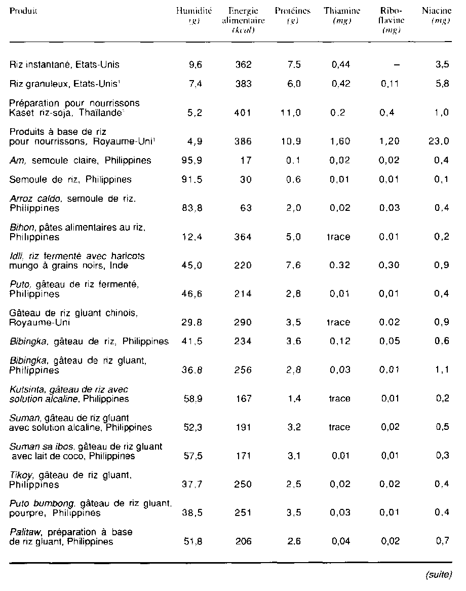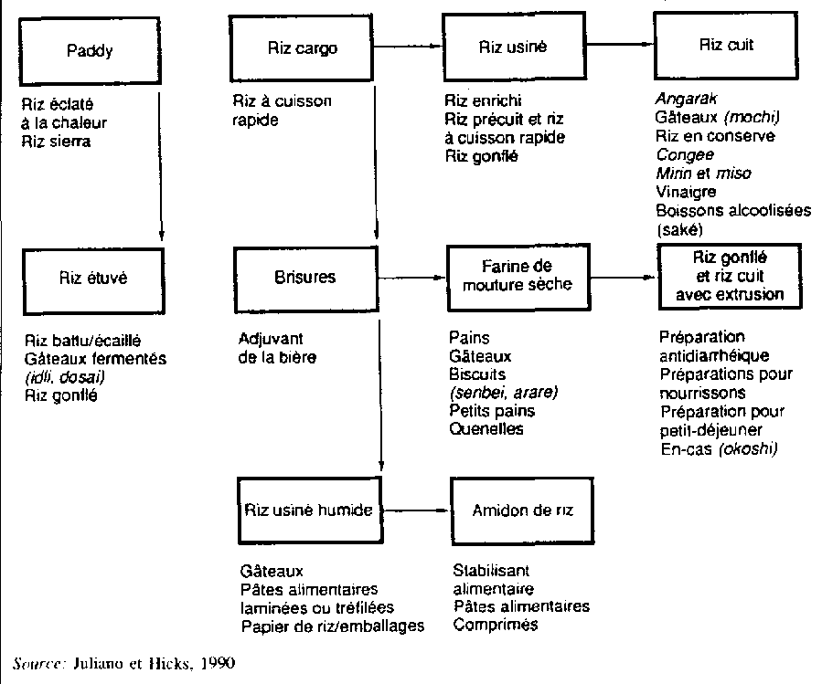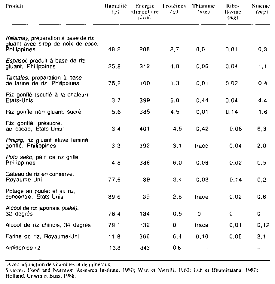 Les produits transformés à base de riz peuvent être fabriqués avec du paddy, du riz cargo, du riz usiné, du riz cuit, des brisures, de la farine de mouture sèche ou humide ou de l'amidon de riz (Juliano et Hicks, 1993) (figure 5). Le tableau 44 récapitule la composition en nutriments de certains produits àbase de riz.
