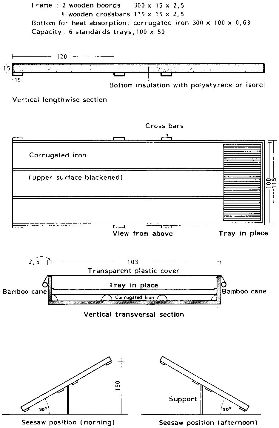 The bottom of the drier is made of galvanised corrugated iron sheets reinforced crosswise by wooden planks and lengthwise by two wooden planks, about 15 cm high. The upper surface of the bottom is painted black. Good thermal insulation can be provided by attaching insulation plates made of lignified wood fiber, expanded polystyrene various layers of corrugated cardboard etc. to the underside of the bottom.