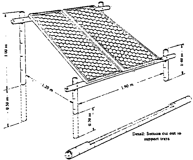 Movement of air around produce is further facilitated by drying on mesh trays rather than on solid platforms. This practice is adopted in Australia, where some 100.000 tonnes/annum of dried fruit -mainly grapes- are produced by sun-air drying. It is also used widely in Colombia both for coffee drying and for cassava drying. Work carried out in Colombia under a joint TDRI/CIAT project has led to an improvement in the eatablished tray drying process for cassava chips. The trays used in this are illustrated in Figure 1 (see Figure 1. Cassava Drying Trays (Colombia) - Sources Best (1979)). They are mde of plastic netting (35 holes/cm ) stretched on wooden frames and supported by chicken wire. The trays are mounted on bamboo supports at an inclination clove to the angle of repose for the chips (28 ), facing the direction of the prevailing wind. In practice the actual angle of inclination depends to some extent on the wind speed, and this also determines the quantity of chips which can be placed on the tray for drying without intermittent turning. For light winds (up to 1 m/s) loadings of 10 kg/m are possible; for steady winds (over 2 m/s) this can be increased to 16 kg/m . The time used for drying by this method is approximately the same as that for drying of chips on a blackened concrete surface. For the latter, however, loadings cannot be increased above approximately 6 kg/m . When all costs are taken into account' the tray drying method is found to be less expensive than drying on blackened concrete (Best 1979).
