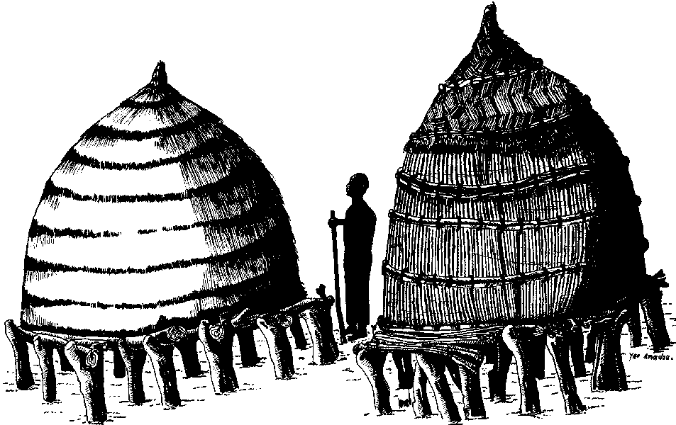 entièrement construit en matériaux végétaux. Il comprend une plate-forme, relativement surélevée (70 à 80 cm), qui le prémunit utilement contre les remontées d'humidité du sol mais surtout contre les dégâts risquant d'être provoqués par les ânes, les chèvres et: les moutons. Cette plate-forme, faite de poutres et: poutrelles en bois, est soutenue par de solides poteaux en forme de fourche. Le corps du grenier et la toiture qui ne font qu'un, sont constitués de trois couches de tiges superposées de la façon suivante: à l'intérieur, une couche de secco, au milieu, des tiges de mil, à l'extérieur, une couche de paille retenue solidairement à la plate-forme à l'aide de fibres végétales.