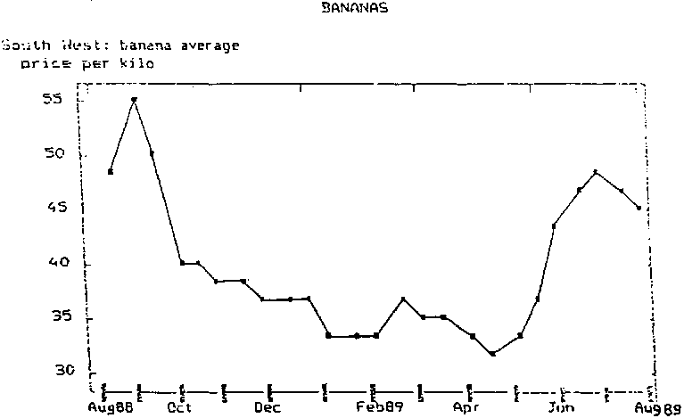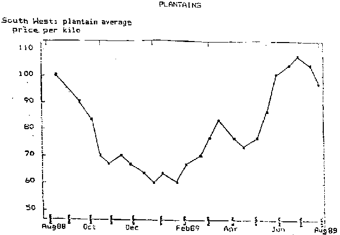 La production et le volume des plantains sur les circuits de commercialisation peuvent être 2 à 3 fois plus abondants en saison sèche qu'en saison pluvieuse (MELIN ET DJOMO, 1972). Le prix du produit en période de forte production est couramment de 1,5 à 2 fois plus élevé (figure 5).