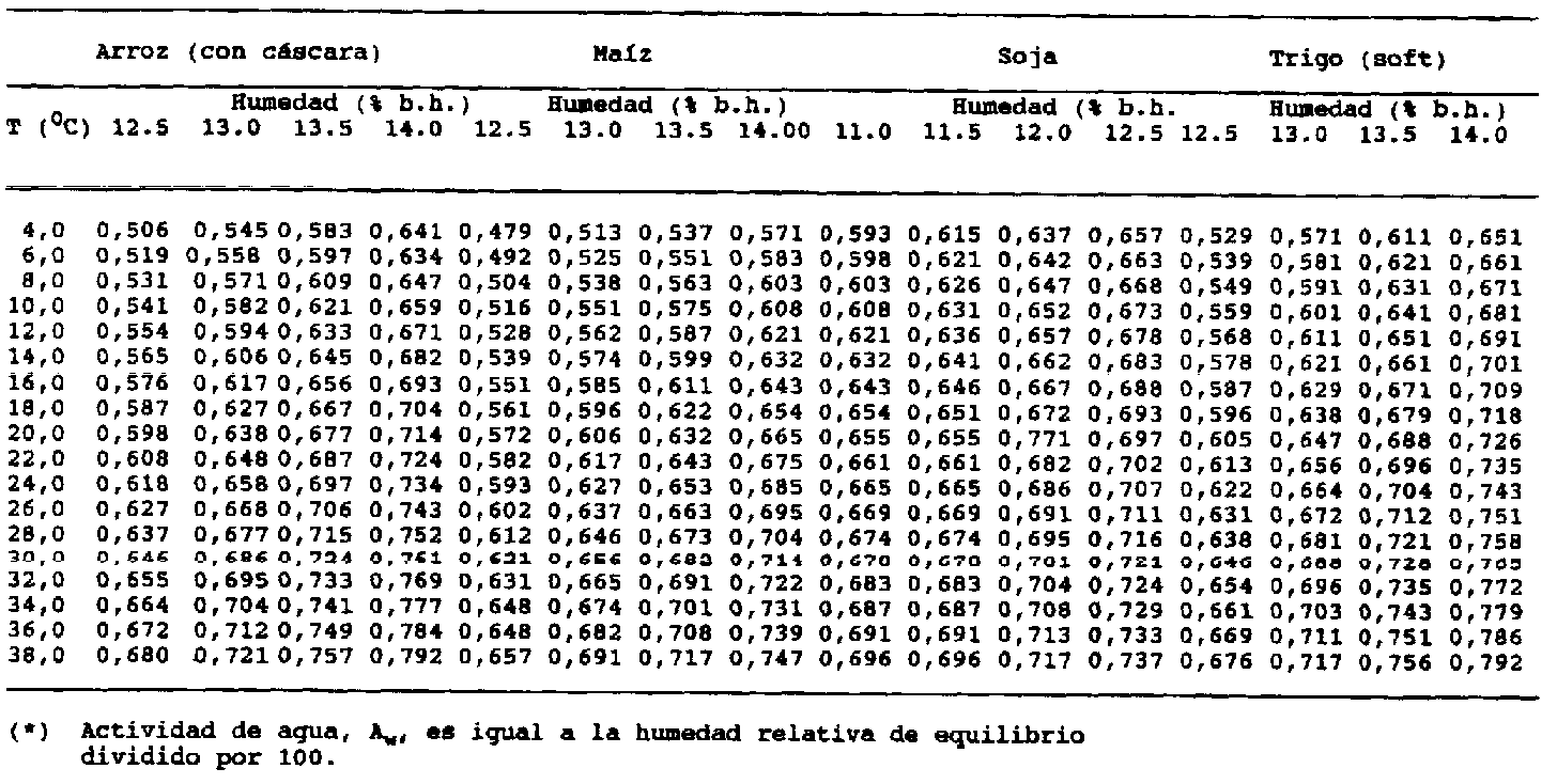En el cuadro 1 se presentan datos de la actividad del agua en algunas especies de granos para temperaturas de 4°C a 38°C, y los contenidos de humedad en que los productos son comúnmente almacenados en América Latina. La actividad del agua de los granos por debajo de 0,65, prácticamente elimina el riesgo de crecimiento de hongos; en consecuencia se evita su deterioro. Los granos con contenido de humedad y temperatura que corresponden a la actividad del agua entre 0,65 a 0,70 pueden ser almacenados por un período de tiempo corto (algunos meses). La actividad de los hongos, con esa disponibilidad de agua, es lenta; por ejemplo, si hubiese un foco de insectos, la elevación de la temperatura debida a la respiración de los mismos podría ocasionar un aumento de la velocidad de crecimiento de los hongos y el deterioro del producto. Los granos con contenido de humedad y temperatura que corresponde a la actividad del agua superior a 0,70 no están en condiciones aptas para el almacenamiento, puesto que la disponibilidad de agua es elevada. En efecto, la actividad biológica de los granos y de los microorganismos será más rápida.