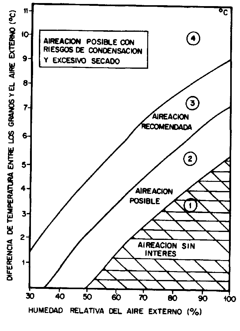 El objetivo fundamental de la aireación es la reducción de la temperatura. Por consiguiente, el proceso debe realizarse cuando la temperatura del aire es inferior en algunos grados a la temperatura del grano. Dos importantes factores deben ser tomados en consideración: la humedad relativa del aire y la diferencia de temperatura entre grano y aire.
