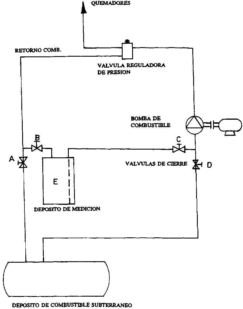 Una solución más barata para hacer mediciones por períodos de una hora o más, se muestra en la Figura 21. Para ello se aprovecha el retorno de combustible, colocando un tanque de unos 200 litros (E) que es llenado por dicho retorno, cerrando la válvula A y abriendo la válvula B. Este depósito tiene una varilla graduada que permite conocer con facilidad el combustible consumido. Cuando este tanque está lleno, se abre la válvula C y se cierra la D, para que el combustible fluya del tanque E hacia la bomba de combustible, y luego al quemador.