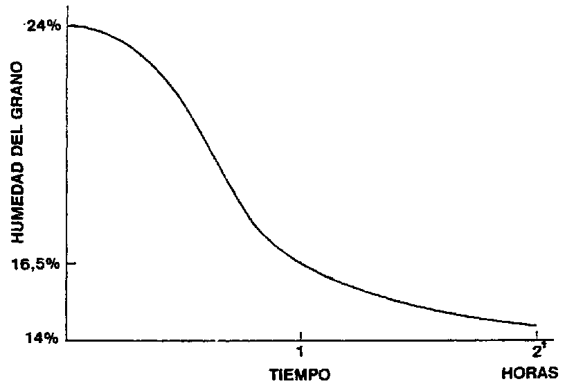 En la Figura 67 se expresa la relación entre la humedad del grano de mm y el tiempo de secado. Se observa que en una partida de grano con humedad del 24%, las tres cuartas partes del secado ocurren durante la primera mitad del tiempo de su permanencia dentro de la secadora, hasta llegar a un contenido de humedad del 16,5% aproximadamente y que el resto, hasta un 14%, es extraído en la otra mitad. Significa que por ejemplo, en la primera hora de secado el grano perdió casi ocho puntos de humedad y en la otra hora sólo 2,5 puntos. Esto es debido a que la eliminación de la humedad es más difícil en los últimos tramos, porque está retenida con mayor fuerza por la masa del grano.