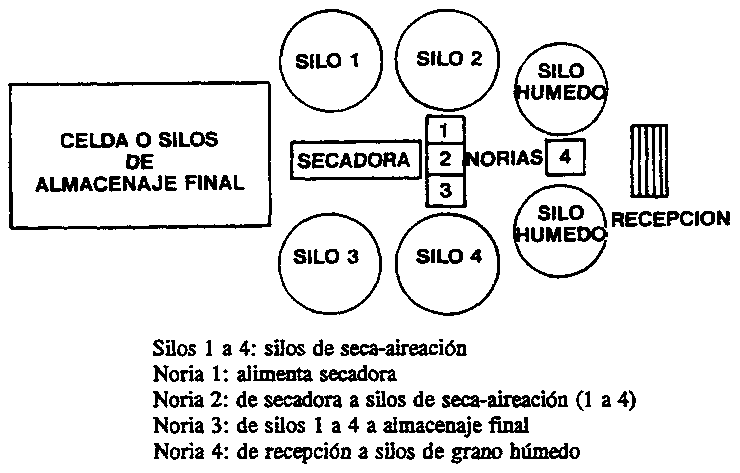 En la Figura 72 se muestra un esquema de una planta de acopio con secaaireación para un proceso continuo de secado durante las 24 horas del día y con cuatro silos de enfriamiento.