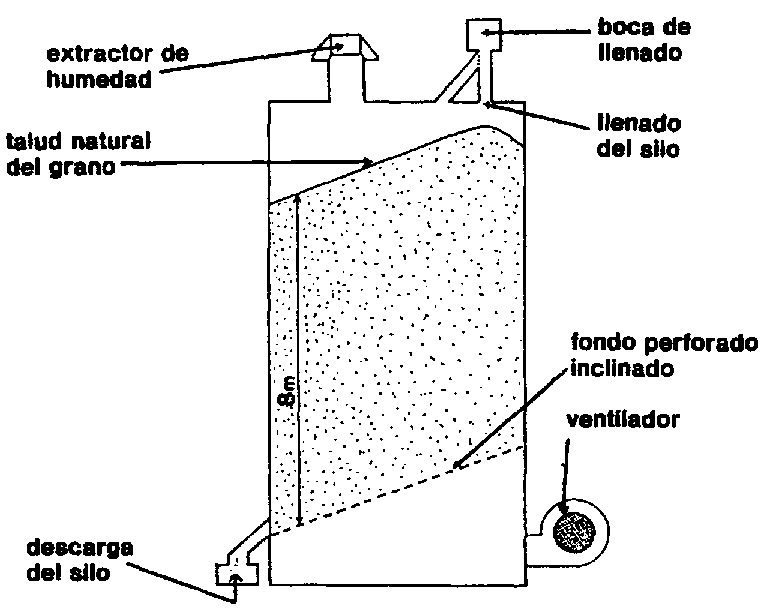 Un silo de 8 m de diámetro, lleno hasta una altura de 8 m, tiene una capacidad de unas 300 toneladas, tamaño conveniente para unas 10 horas de trabajo de una secadora rindiendo 30 toneladas por hora.