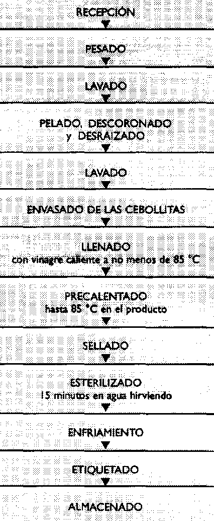 En la Figura 64 se muestra el diagrama de flujos para el proceso de elaboración de cebollas encurtidas en vinagre. Algunas operaciones de este proceso se pueden apreciar en la fotografía 234.