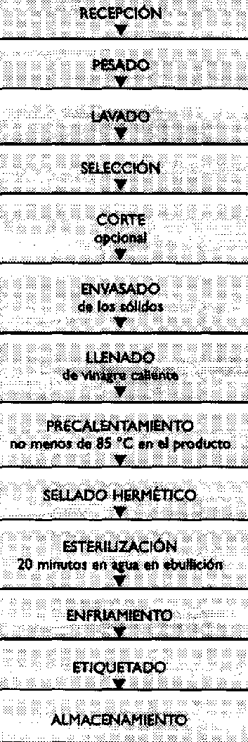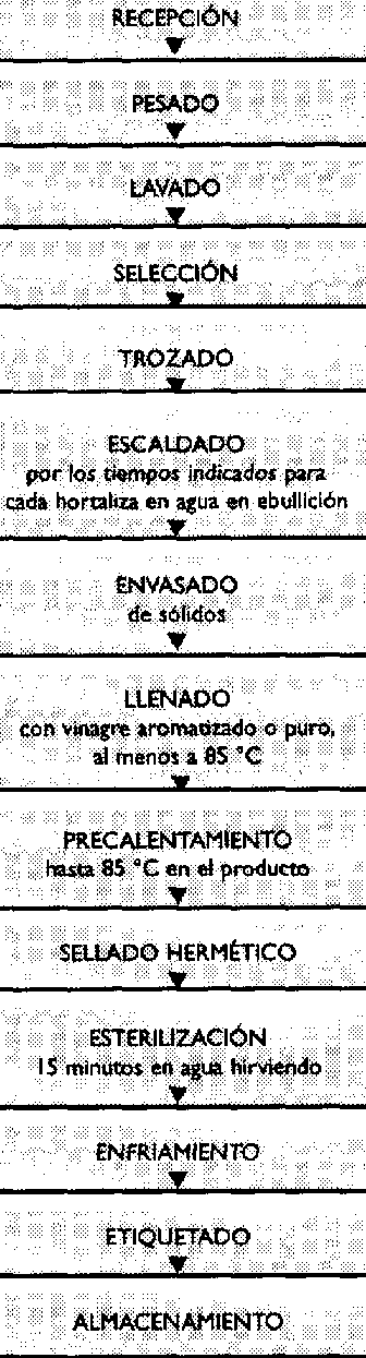 Después de llenar los frascos con las hortalizas, se vierte vinagre aromatizado caliente (ver 4.6.3.7.), para luego precalentarlos en baño María hasta alcanzar la temperatura de 85 °C, luego de lo cual se sellan los frascos, se esterilizan en agua hirviendo por 15 mio, se enfrían por rebalse, se etiquetan y se almacenan.
