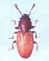 Descripción. Esta especie es muy semejante a Tribolium. El cuerpo es más delgado y la cabeza sobresale más hacia adelante. Las antenas son más cortas que la cabeza y tienen forma de maza compacta, formando 5 segmentos. El adulto mide de 2 a 3 mm de longitud y es de un color café amarillento y más pálido que Tribolium.