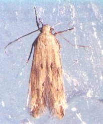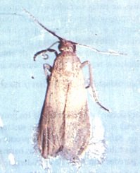 Endrosis sarticella. Polilla de los productos almacenados en las despensas, en almenó dra, nuez, fríejol, en las reglones del Aconcagua, Valparaíso, Santiago, e Islas de Pascua y Juan Fernández.