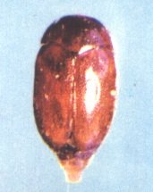 Descripción. El adulto es diminuto, ligeramente oblongo y aplanado. Los costados de la frente de la cabeza están proyectados y extendidos hacia atrás, sobre la parte frontal de los ojos. La longitud del adulto es de 2,5 a 3,0 mm. Su color es café rojizo.