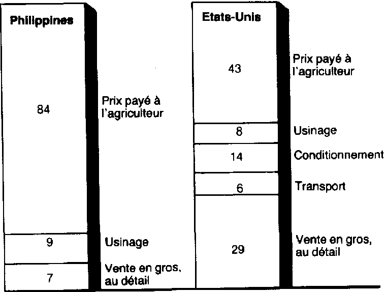 Il faut etre tres prudent lorsqu'on tire les conclusions du pourcentage de marge de commercialisation. Aux Philippines comme dans beaucoup d'autres pays en développement, les riziculteurs touchent une plus grosse part du prix de détail payé par les consommateurs que les producteurs des Etats-Unis. A premiere vue, l'exploitant américain peut paraître défavorisé en raison de la part de la marge totale prise par le cout de l'emballage (voir figure 1.6). Cependant, dans le contexte des Etats-Unis, la vente du riz au détail sans préemballage aurait pour résultat a la fois de décourager la consommation et d'accroître la marge totale vu les frais élevés de la main-d'ouvre dans le commerce de détail.