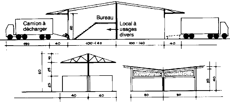 Marchés de producteurs au Brésil. A la fin des années 70, 20 marchés modeles de ce type ont été mis en place par la société étatique brésilienne COBAL, afin de relier les agriculteurs opérant dans des régions qui offraient peu de débouchés a leurs produits au systeme de commercialisation. Ces marchés se caractérisaient par une plate-forme surélevée a l'abri du soleil et des intempéries, et par un local clos a l'usage des services. On trouvera a la figure 8.2 un croquis de base se pretant a agrandissement en fonction du volume de transactions escompté. Le plan est simple et offre de multiples possibilités d'aménagement.
