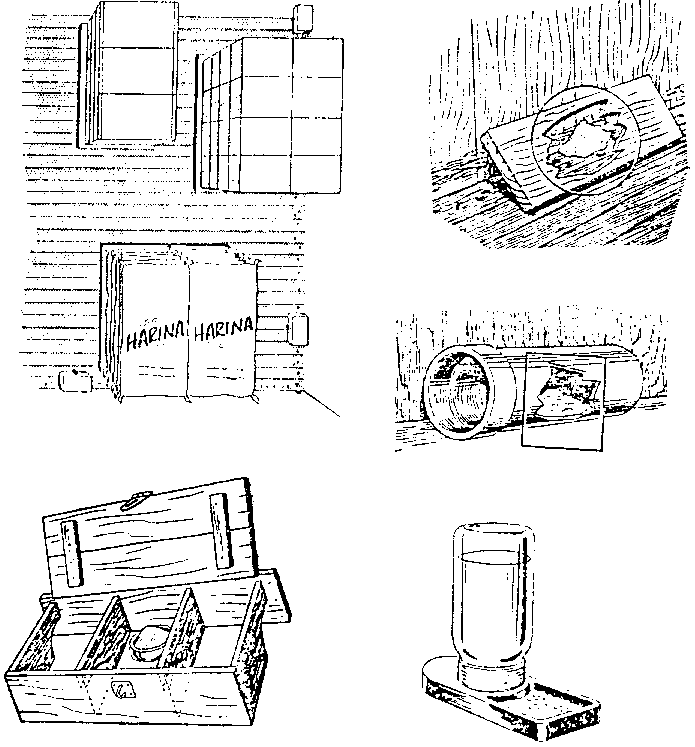 Los requisitos de seguridad para la protección de seres humanos, ganado, aves de corral, animales domésticos, etc., determinan la selección de los métodos de envenenamiento para control de roedores. Por razones discutidas anteriormente los únicos rodenticidas que pueden recomendarse son los venenos crónicos. De todas maneras, son venenos; ningún rodenticida conocido es completamente seguro en su uso. Aunque los rodenticidas crónicos son considerados menos peligrosos para los seres humanos y para los animales domésticos, pueden, bajo ciertas condiciones, causar la muerte. Los cebos deben colocarse en lugares de fácil acceso para las ratas y ratones, pero que no lo sean para niños ni otros animales. Los cebos deben estar al alcance de todos los roedores durante suficiente tiempo hasta que se logre el exterminio de la población. Los recipientes de cebo se deben inspeccionar con tanta frecuencia como sea necesaria para mantener un suministro adecuado de cebo fresco y aceptable. Se debe colocar estratégicamente un número adecuado de recipientes de cebo. En ciertos lugares donde no se dispone fácilmente de agua puede ser conveniente utilizar cebos líquidos (Figura 25).