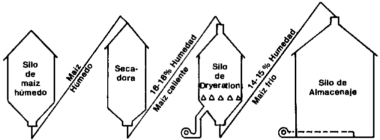 La figura 1 proporciona una idea mas clara del proceso. Como se indica, el grano húmedo de maíz se recibe en la secadora desde los silos respectivos y se calienta a las temperaturas corrientemente usadas hasta obtener el porcentaje de humedad indicado (16-18%). Como la secadora no tiene que enfriar el grano, se puede utilizar totalmente su volumen en esta operación y de esa manera, aumentar su capacidad en buena proporción.