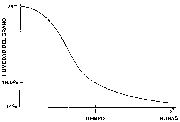 En la figura 2 se expresa la relación entre la humedad del grano de maíz y el tiempo de secado. Se observa que en una partida de grano con una humedad inicial del 24%, las tres cuartas partes del secado ocurren durante la primera mitad del tiempo de su permanencia dentro de la secadora, hasta llegar a un contenido de humedad del 16,5% aproximadamente y que el resto, hasta un 14%, es extraído en la otra mitad. Significa que por ejemplo, en la primera hora de secado el grano perdió casi ocho puntos de humedad y en la otra hora sólo 2,5 puntos. Esto es debido a que la eliminación de la humedad es más dificil en los últimos tramos, porque está retenida con mayor fuerza por la masa del grano.