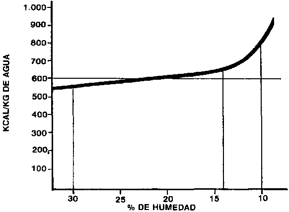 En efecto, la gráfica indica que para granos con un 30% de humedad, sólo se requieren unas 500 a 600 kcal por kg de agua, mientras que cuando esa humedad ha llegado al 15% las necesidades energéticas aumentan y pueden acercarse a 700 kcal por kg de agua. Es decir, al principio del secado el consumo de combustible, que es el encargado de suministrar las kcal necesarias, es menor proporcionalmente que hacia el final del proceso.