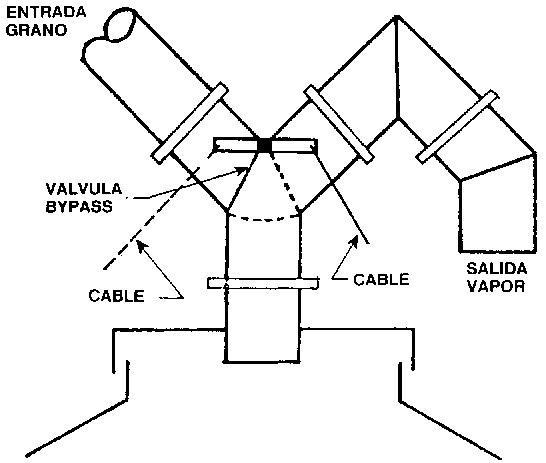 También se pueden colocar respiradores apropiados y aberturas por donde pueda escapar el aire húmedo. Asimismo puede ser necesario colocar válvulas 0 trampas en las bocas de descarga (figura 16) para evitar que los vapores húmedos se metan a los tubos y conecciones, lleguen a la cabeza de las norias y a otros silos, ocasionando humedecimientos que pueden provocar deterioros de los granos por apelmazamiento de las impurezas, atascamientos en tubos y perforaciones.