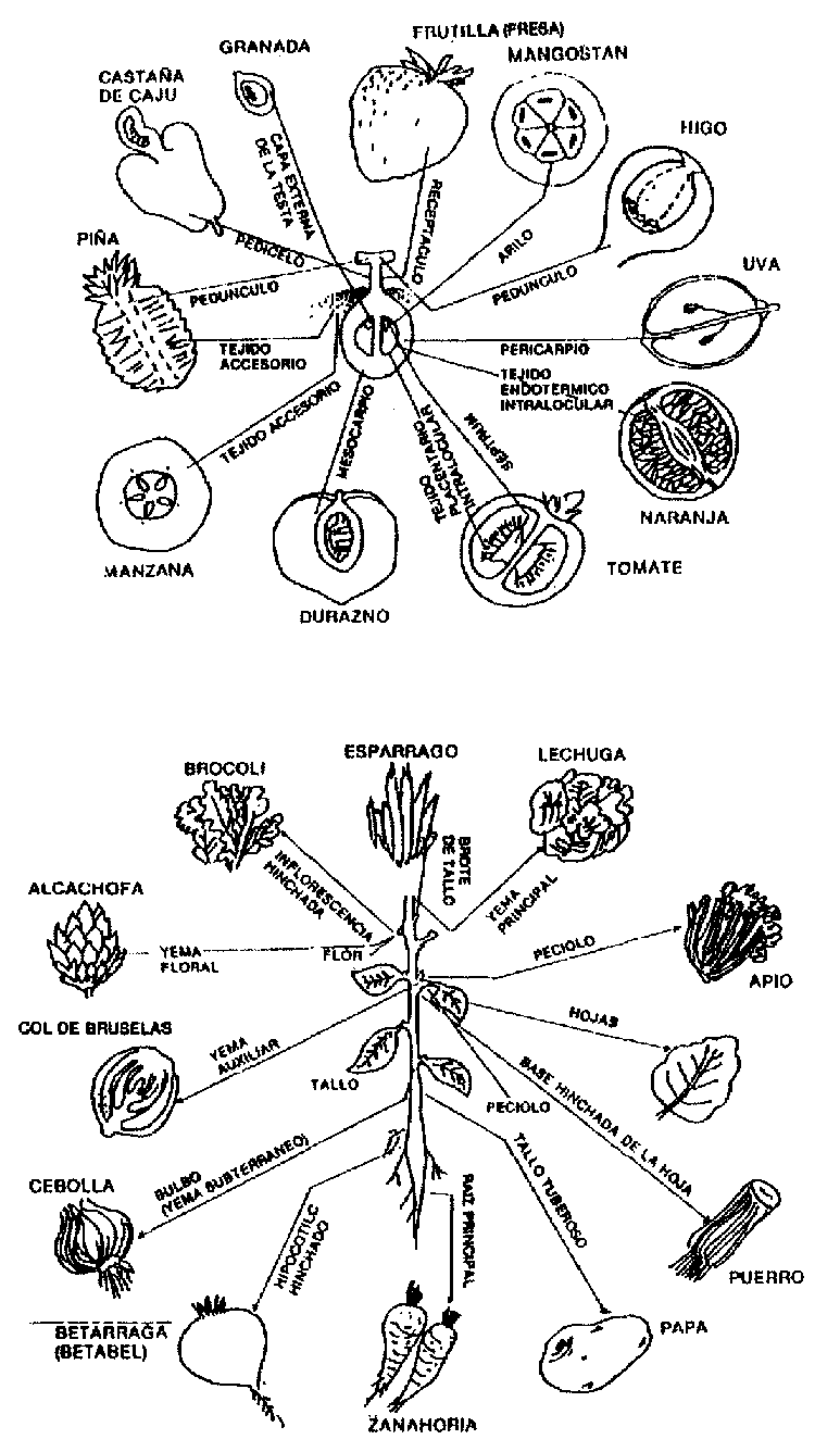 Comparadas con los otros alimentos, las frutas y hortalizas se caracterizan por una extrema diversidad de tamaño, forma, estructura y fisiología (Figura 1). Esta diversidad es el resultado de la evolución y de la selección natural, por supuesto algo es debido a los programas de cruzamiento en que las porciones comestibles han sido acentuadas.