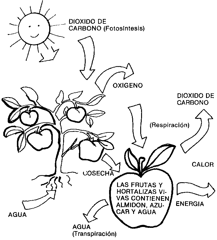 Las frotas y hortalizas frescas necesitan respirar a fin de obtener la energía suficiente para la mantención de la vida. Respiran absorbiendo oxigeno de la atmósfera y liberando dióxido de carbono, tal como lo hacen el hombre, los animales y otros organismos. Durante la respiración la producción de energía proviene de la oxidación de las propias reservas de almidón, azucares y otros metabolitos, Una vez cosechado, el producto no puede reemplazar estas reservas que se pierden y la velocidad con que disminuyen será un factor de gran Importancia en la duración de la vida de poscosecha del producto.