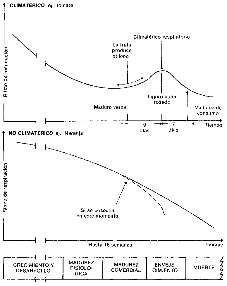 Cuando las frutas climatéricas maduran la velocidad de la respiración se eleva llegando a un máximo y luego declina hasta el comienzo del envejecimiento, mientras que en las frutas no climatéricas la tasa de respiración decrece gradualmente. El etileno esta presente en todas las frotas y ahora se le reconoce como la principal hormona de la maduración que, en las frutas climatéricas puede en realidad iniciar la maduración a concentra clones umbrales tan bajas como 0.1 a 10 partes por millón (ppm). Sin embargo, el etileno aplicado exógenamente influye en el proceso de maduración tanto en las frotas climatéricas como no climatéricas. Por ejemplo, en el plátano (climatérico) el etileno inicia y acelera la maduración de frutas verdes, pero en la piña (no climatérica) el etileno simplemente aumenta la velocidad de respiración y acelera un proceso de maduración ya iniciado por la fruta misma.