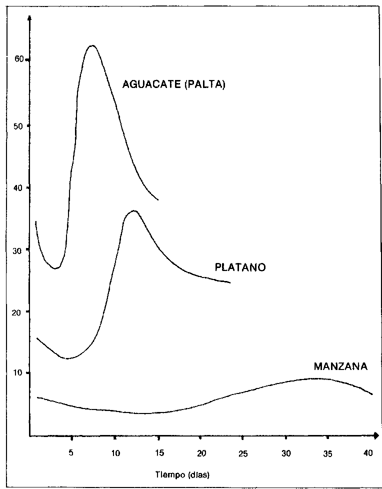 Las frutas pueden dividirse en dos tipos, climatéricas y no climatéricas (Cuadro 2). En las frotas no climatéricas el proceso de madurez y sazón, es un proceso gradual pero continuo. En las frutas climatéricas, el proceso natural de madurez y sazón, es iniciado de acuerdo a cambios en la composición hormonal El inicio de la maduración climatérica es un proceso bien definido, caracterizado por un rápido aumento en la velocidad de la respiración y el desprendimiento de etileno por la fruta, en un momento de su desarrollo, conocido como respiración climatérica. Estas diferencias en el patrón de maduración se ilustran gráficamente en las Figuras 8 y 9.