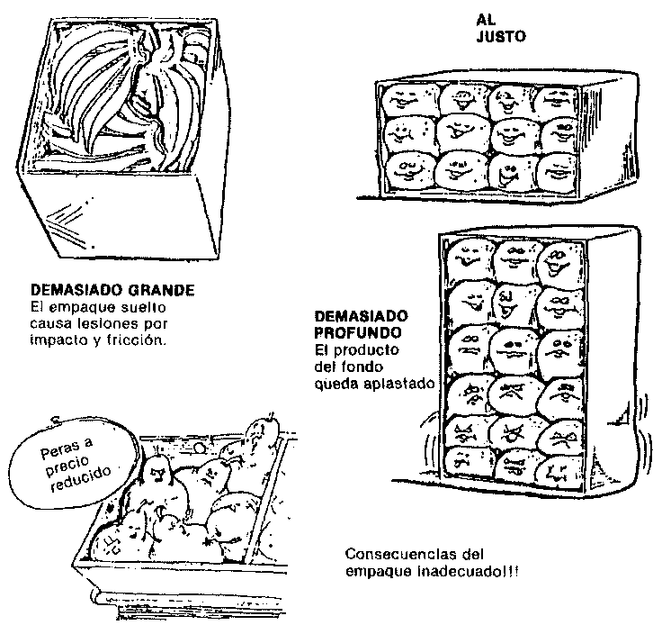 Vale la pena notar que el empaque usualmente es el elemento de poscosecha que puede cambiarse con más facilidad, ya que existe una tendencia a culpar a un empaque inadecuado de los altos niveles de deterioro, sin antes llevar a cabo un análisis detallado de toda la cadena de la manipulación y mercadeo. Alli donde las perdidas son demasiado altas es poco probable que el cambio de envase de como resultado alguna disminución signficativa, si no se mejoran al mismo tiempo las técnicas de cosecha, la manipulación en el campo, clasificación par calidad y sistema de transporte. Por lo tanto, deben introducirse nuevos tipos de envases como uno de los componentes de un programa integrado para mejorar las técnicas de manipulación a lo largo de toda la cadena de mercadeo (Figuras 29 y 30).