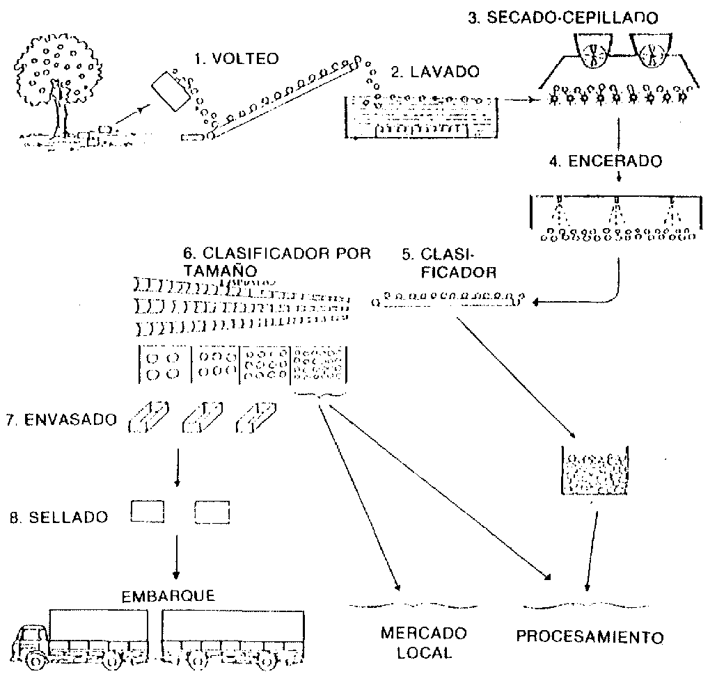 - Empaque, incluyendo lavado, encerado, tratamiento con fungicida, clasificación, separación por tamaño, envasado;