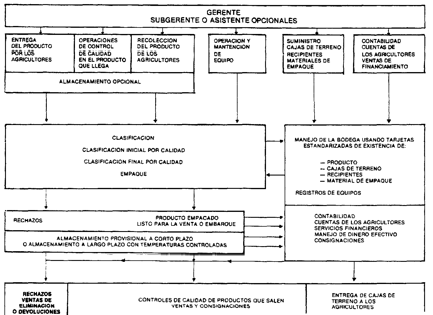 La tarea del administrador de una bodega de empaque es mantener el flujo regular del producto desde las áreas de entrega hasta el despacho, a través de las lineas de manejo y empaque. Los cuellos de botella en el sistema, ocasionan invariablemente daño y deterioro del producto y son causados frecuentemente por fallas de la maquinarla, o por la incapacidad de compatibilizar las necesidades de mano de obra con las entregas anticipadas. Los programas regulares de mantenimiento de todo el equipo y la capacitación del personal para manejar correctamente la maquinaria y el producto son por lo tanto un aspecto Importante de la administración. El administrador debe también estar preparado para adoptar un criterio flexible con respecto a las operaciones, por ejemplo, cuando se producen demoras, cambiar algunas operaciones a dos lineas cortas de empaque en lugar de una sola línea larga.