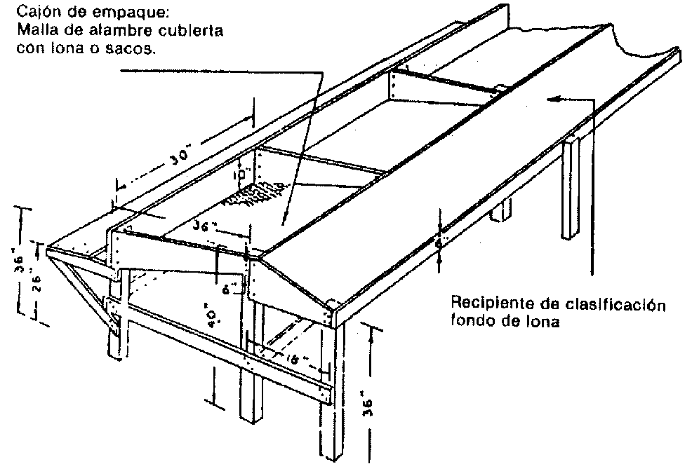Las lineas de empaque difieren muchísimo de acuerdo al tipo y cantidad del producto. Ellas pueden consistir de simples tablas inclinadas en donde el articulo es recortado, limpiado, clasificado, separado por tamaño y envasado. Este tipo de operación es perfectamente aceptable para pequeñas cantidades (Figura 49). Para mayores cantidades de producto, son más usadas las lineas mecánicas especializadas de preparación y manejo.