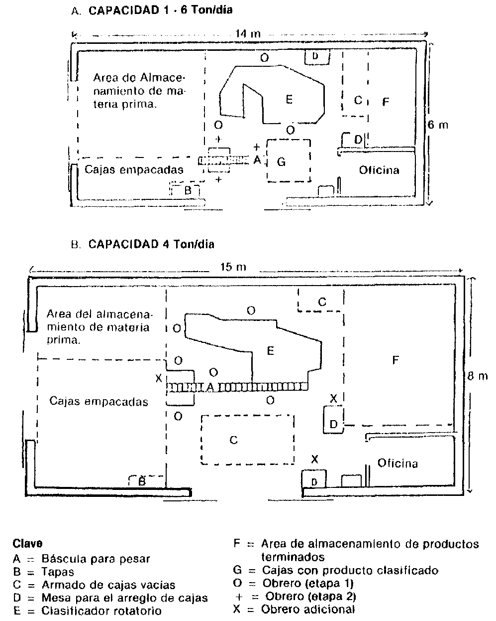 El diseño de la bodega de empaque debe estar adaptada a todos aquellos factores descritos con anterioridad y que tienen relación con las necesidades específicas de una operación planificada. El diseño global, debe asegurar suficiente espacio en el piso para una libre circulación, que las puertas sean suficientemente anchas para el paso de vehículos y pallets, que las áreas de almacenamiento sean suficientes para los materiales de empaque, que todas las superficies puedan ser lavadas y drenadas con facilidad, que haya una oficina de administración relativamente limpia y tranquila y que los trabajadores tengan un área limpia donde puedan lavarse y comer con razonable comodidad (en la Figura 52 se muestran ejemplos de 2 diferentes diseños).