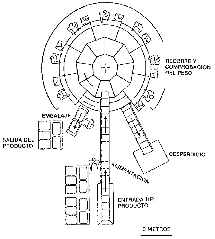 Preparación de la cosecha y área de empaque. Esta debe ser seca, limpia, bien ventilada y con buena iluminación. Las lineas de manejo y empaque son por tradición de diseño lineal, pero pruebas recientes han indicado que para ciertos cultivos, una unidad de empaque de diseño rotatorio, tal como la que se muestra en la Figura 53, puede ahorrar un 20-30 % de trabajo.