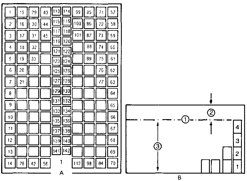 NOTA: El diagrama superior (A) ilustra la utilización máxima del espacio de 142 pilas de palets con una distribución correcta que permite la buena circulación del aire. Puede usarse toda el área y sólo el espacio F se deja para acceso en la puerta. Si se necesita acceso al producto de las partes laterales, las posiciones 113 a 142 pueden transformarse en un pasillo central. Como alternativa se pueden dejar libres dos pasillos laterales retirando las posiciones 29 a 56 y 85 a 112.
