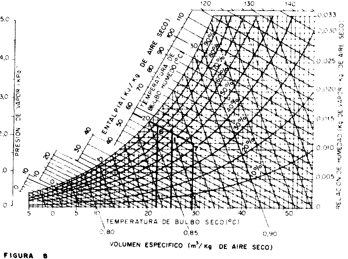 La Figura 7 muestra el enfriamiento de una masa de aire con sus propiedades termodinámicas definidas en el punto de estado 1 (T = 25 °C y Tbh = 20 °C) hasta el punto de estado 4. Se observa que el punto de estado se desplaza horizontalmente hacia la izquierda hasta llegar a la línea de saturación, lo que indica que se alcanzó el punto de rocio (punto 4). Si el enfriamiento continúa hasta la temperatura de 14 C (punto 5), habrá condensación de 0,0027 kg de vapor/kg de aire seco, y la entalpía del aire disminuirá en 18,5 kJ/kg de aire seco. En el Cuadro 5 constan los valores de las propiedades termodinámicas del aire en el proceso descrito.