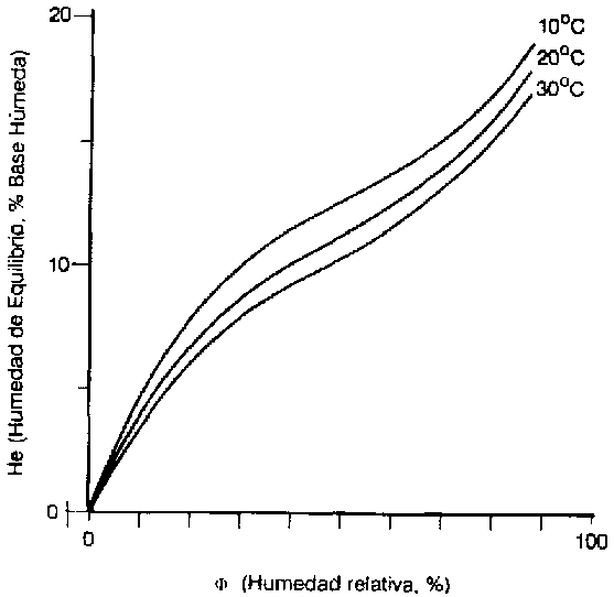 Los materiales biológicos presentan la isoterma de sorción del tipo mostrado en la Figura 10. Una isoterma es simplemente una curva que relaciona el contenido de humedad de equilibrio de un producto, con la humedad relativa del aire o actividad de agua del producto.