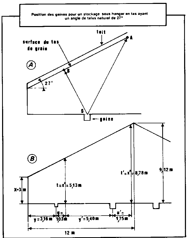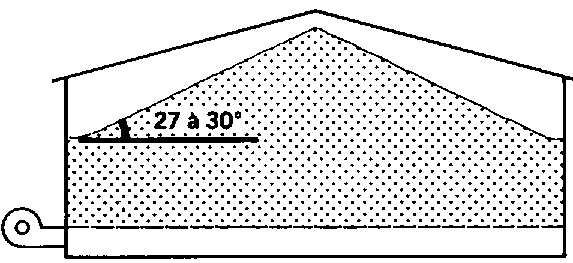 Position des gaines pour un stockage sous hangar en tas ayant un angle de talus naturel de 27°