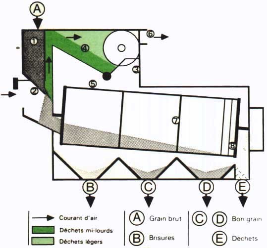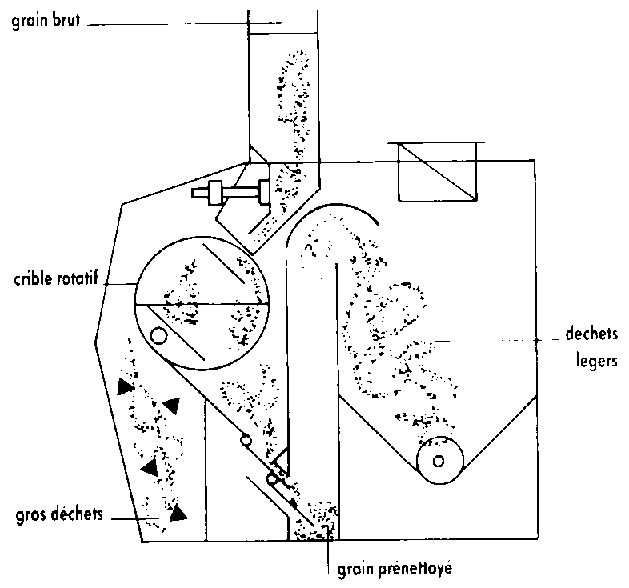 Le grain non nettoyé tombe sur un crible rotatif et le traverse. Les grosses impurtetés ne passant pas au travers de ce crible sont éliminées. Le grain ayant traversé le tambour est soumis à un courant d'air qui entraîne les particules légères et les fines brisures.