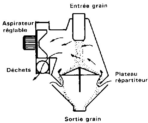 Il s'agit d'un appareil qui effectue seulement le tri du grain et des particules légères ou sèches et volumineuses par ventilation. Le flux de grain traverse une chambre équipée de chicanes. Un courant d'air d'un débit réglable la traverse et fluidise l'ensemble du produit en évacuant les déchets légers et en laissant passer le grain.