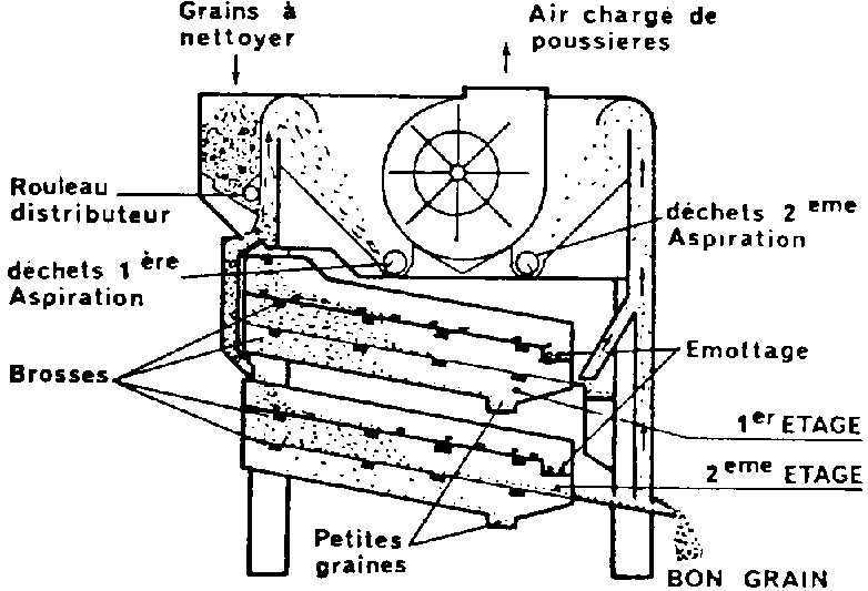 Les grains sont introduits dans l'appareil par une trémie d'alimentation. Une vanne à contrepoids ainsi qu'un rouleau cannelé assurent une nappe régulière du grain et une distribution sur toute la largeur de la grille. Les grains passent alors dans un courant d'air et tombent sur la grille supérieure. Celle-ci arrête les grosses impuretés (cailloux, épis, spathes, tiges, etc..) qui sont évacuées sur le côté. Au passage dans le courant d'air une grande partie des déchets est éliminée, ces derniers sont récupérés dans une chambre de détente puis sont évacués par une vis ou un rouleau à palettes. Le dégommage de cette première grille est assuré par des boules en caoutchouc, des marteaux ou des brosses.