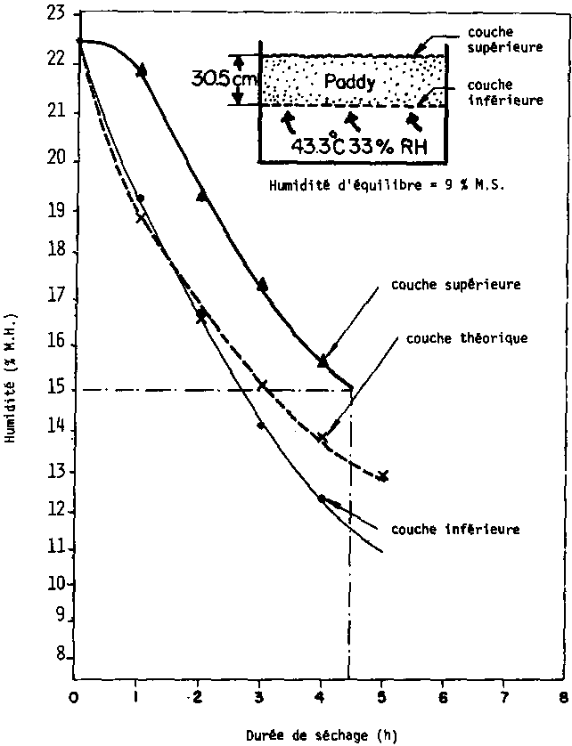 Fig. 29: Vitesse de séchage du paddy avec de l'air à 43° C. Débit 1920 m³/h/m³ grain.